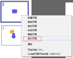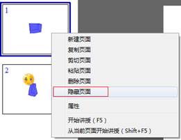 在软件界面左侧的缩略图预览区选中待隐藏的页面,在右键菜单中选择“隐藏页面”,讲授时即隐藏该页面。同时,右键菜单中的“隐藏页面”变为“显示页面”。