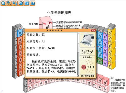 在主界面,点击任意元素,界面的上部的单个元素展示区即可展示该元素的原子质数、元素符号、元素名称、相对原子质量及该元素的具体信息包括:文字说明、实物图片展示、电子层排布和原子结构示意图。如下图所示铝元素: