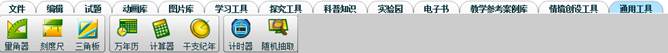提供小学科学教学和学习中及用于教师课堂活动的组织工具,如量角器、刻度尺、三角板、万年历、计算器、干支纪年、计时器、随机抽取等。单击“通用工具”选项标签,即可看到其功能菜单,如下图所示: