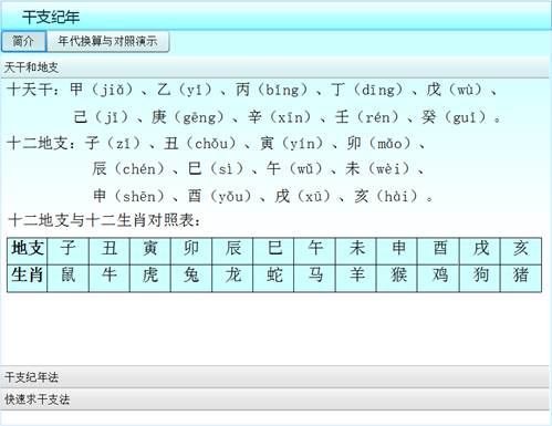 单击“天干地支纪年”辅助工具,主要介绍了天干、地支、天干地支纪年法以及快速算求干支纪年的方法,还提供了公元纪年与干支纪年的对照演示工具,方便用做常识掌握、随时进行纪年转换查询。