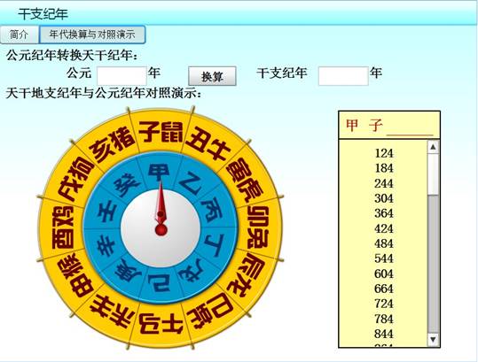 通过鼠标转动天干和地支罗盘,指针对应的干支纪年落定后,在右侧会出现相对应的多个公元纪年。如图所示: