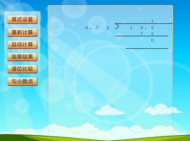 以除法竖式为例,界面中,左侧有6个功能按钮,中部是手工录入或自动显示区,刚启动时中间区域显示的是除法素材文件中的运算数和运算符号,除号符号下的矩形区域用于保存录入的被除数,除号符号左边的矩形区域用于保存录入的除数,除号符号上的矩形框用于录入商值,下部是手工录入或自动显示区。刚启动时显示了除法素材文件中的运算数和运算符号。需要录入数值时,请首先直接用鼠标左键点击商值位置中的矩形框,就可以录入数了,然后,在程序自动出现两行矩形框用于录入中间乘积和中间差值。如果录入错误或不符合要求,会有提示对话框出现进行指导。每个商值矩形框中只能输入一个0—9的数值,当商值的数字为 1- 9时,程序自动在界面下部出现两行矩形框用于录入中间乘积和中间差值。当商值中有小数点时,请在某个数字的后面填入小数点,小数点不要占用一个矩形框位置。