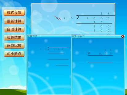 这功能模板用于用户检验自己手工录入的计算结果是否正确。具体操作处理为:用鼠标点击该按钮,系统会出现验算对话框,在乘法验算对话框中用户可以自由录入被乘数、乘数、中间乘积、积等数值,用于验算计算除法竖式时所录入的商是否正确;在除法验算对话框中用户可以自由录入被除数、除数、商等数值,用于验算计算除法竖式时所录入的和数是否正确。
