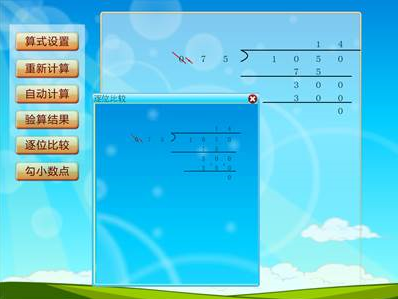 它用于与手工输入的结果进行比较,更便于使用者观察发现运算中存在问题。操作处理为:用鼠标点击该功能按钮,系统出现另外一个对话框,里面自动包含已经录入的运算数和运算符号,在对话框上点击鼠标左键一次,系统自动计算一次一个数位上的数,连续点击鼠标左键,逐次进行一步计算,最后完成整个处理,计算出商和余数。鼠标点击画面一次,自动计算一步并显示有关商、中间乘积、余数。(具体操作、处理方法类似‘自动计算’,但无特殊颜色显示当前运算数字提示)。