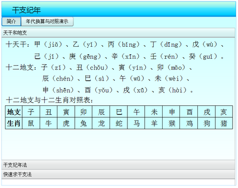 天干地支纪年工具主要介绍了天干、地支、天干地支纪年法以及快速算求干支纪年的方法,还提供了公元纪年与干支纪年的对照演示工具,方便用做常识掌握、随时进行纪年转换查询。