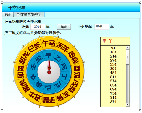 通过鼠标转动天干和地支罗盘,指针对应的干支纪年落定后,在右侧会出现相对应的多个公元纪年。