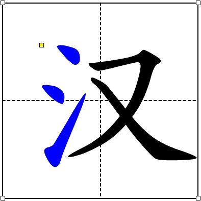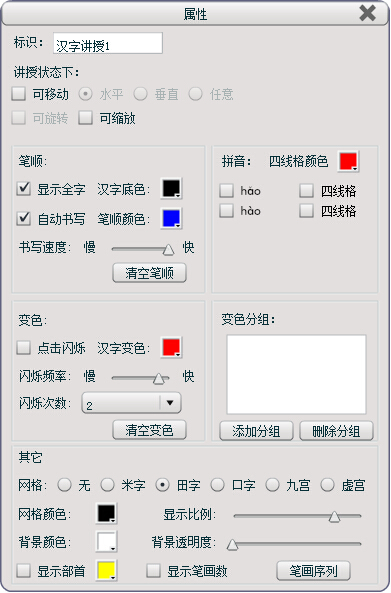 笔画变色:(1)汉字添加到平台后,单击任意笔画即可使单个笔画变色。(2)也可以将笔画进行组合同时变色。使需要组合的笔画均处于变色状态,点击属性面板上变色分组中的“添加分组”按钮